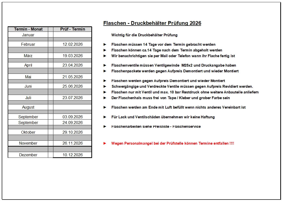 Die Druckbehälter Prüfung wird nicht bei uns im Hause durchgeführt. Wir bereiten die Druckluftflaschen für die Druckprüfung vor, bringen sie zur Sammelstelle und holen sie wieder ab.